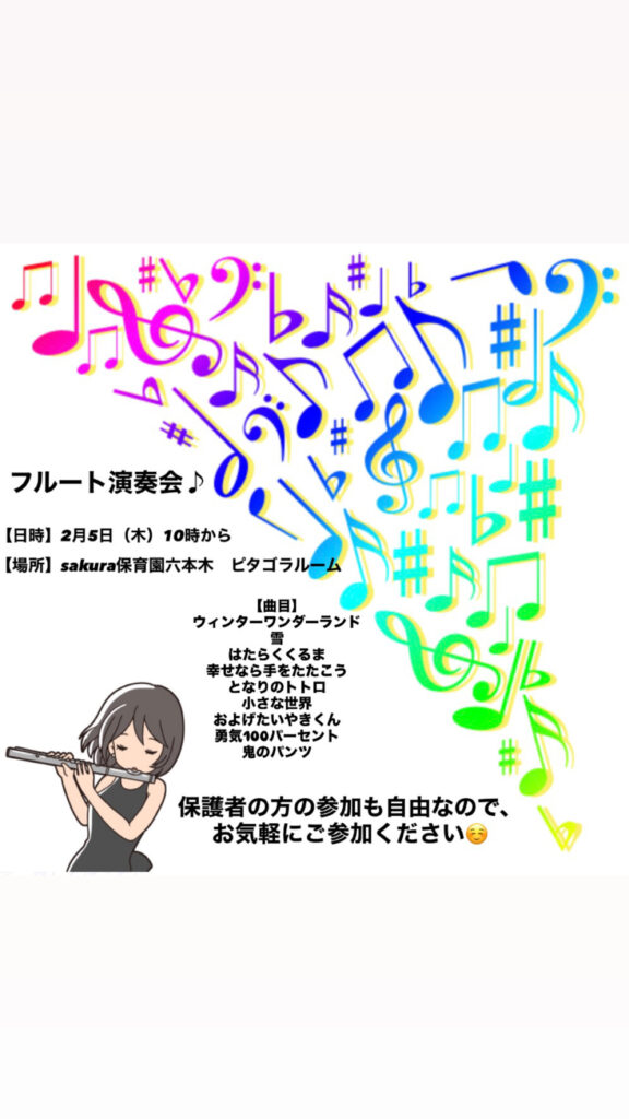 子どもたちが日頃歌っている歌や知っている歌、季節の歌などさまざまな曲をフルートで演奏してくれます!